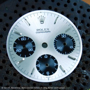 Un trabajo complejo und alto niveles el que os presentamos. un modelo legendario, Rolex Cosmograph . Sólo restaurar la esfera und fondo soley platinado y con los 3 discos secundarios en negro ha requérido 4 meses trabajo delicado, minucioso y estricto. Die Replik der Marke Rolex und die Leyenda Cosmograph Requiere de un detalle extremo. Sólo unas imágenes como las ques os mostramos puede expresar el resultado final. Bajo Nuestro Kriterium, un trabajo excelente.